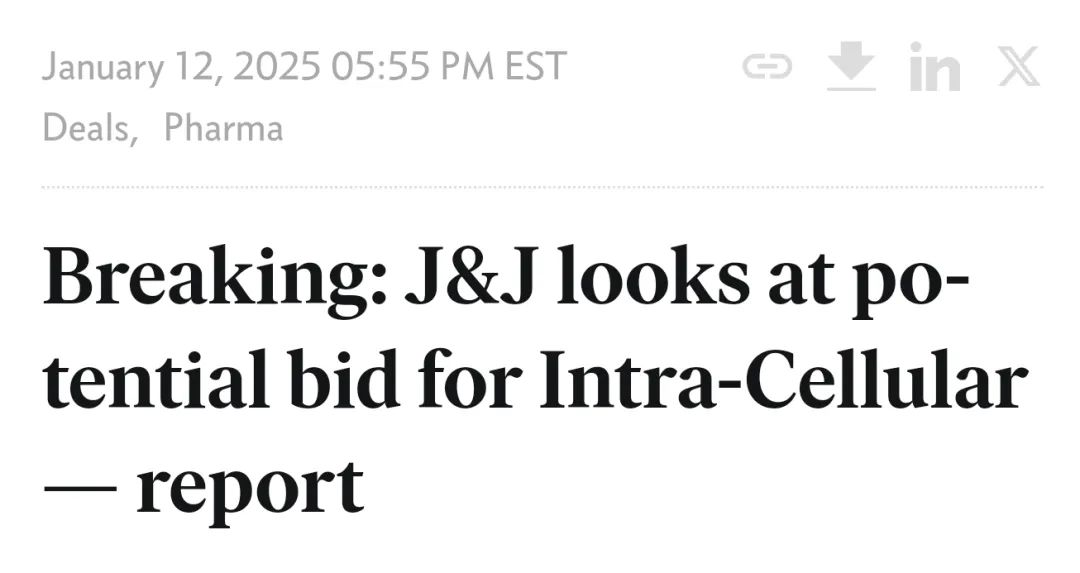 2025年1月13日,JPM大会同期,制药巨头强生/J&J宣布以146亿美元(约1069.47亿人民币)的总估值收购美国纳斯达克上市新药企业Intra-Cellular。外媒们曾在1月12日提前泄漏了本次交易。
