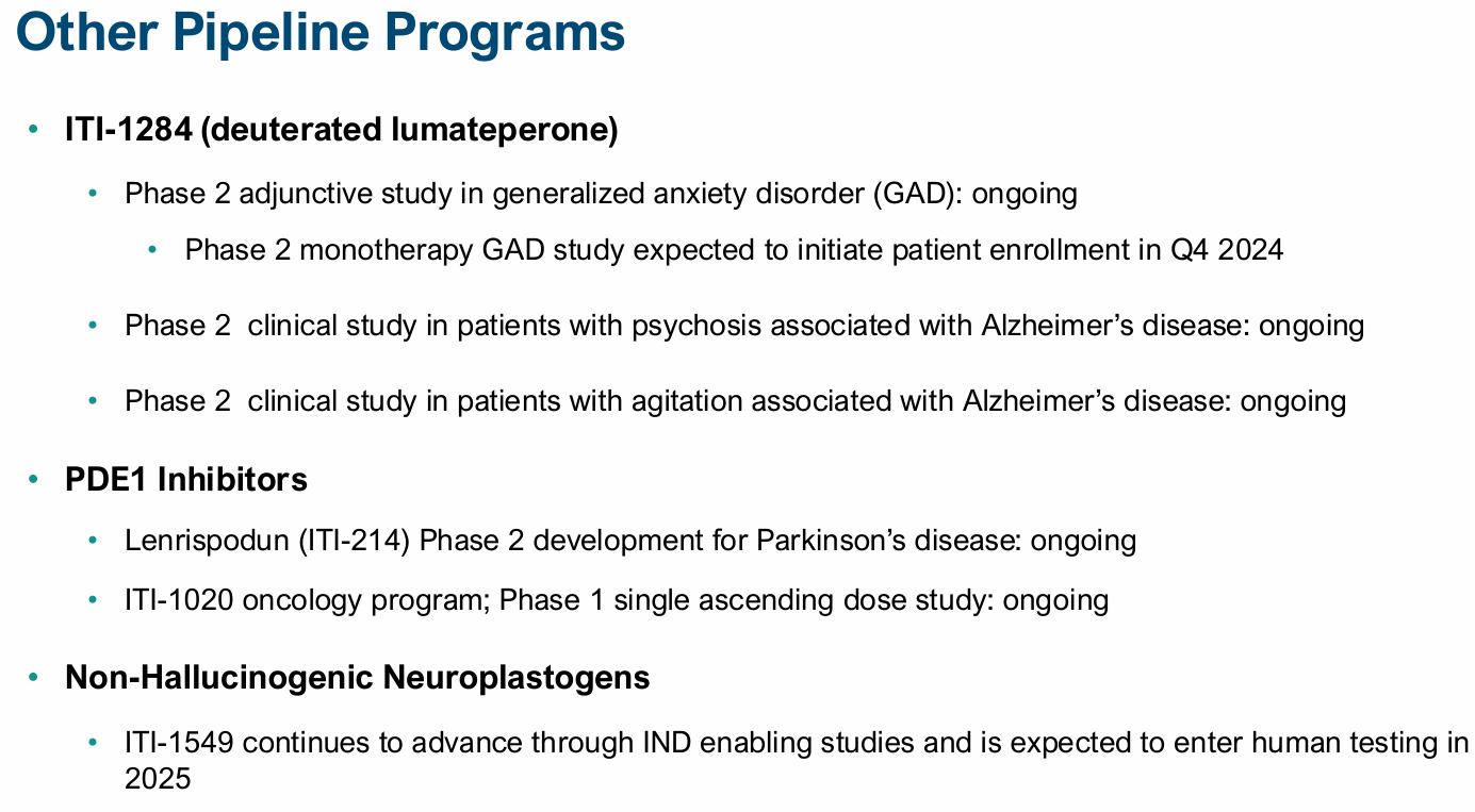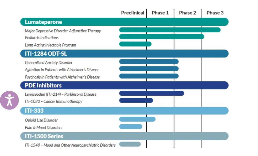 Intra-Cellular在研候选产品 ITI -1284(为一款氘代新药,原型即Lumateperone),正在处于2期临床研究阶段,针对广泛性焦虑障碍(GAD)和阿尔茨海默病相关的精神疾病和躁动方面进行开发。其他候选分子还有Lenrispodun(PDE靶点)、ITI-1020(PDE靶点,用于肿瘤开发)、ITI-333、ITI-1549等。