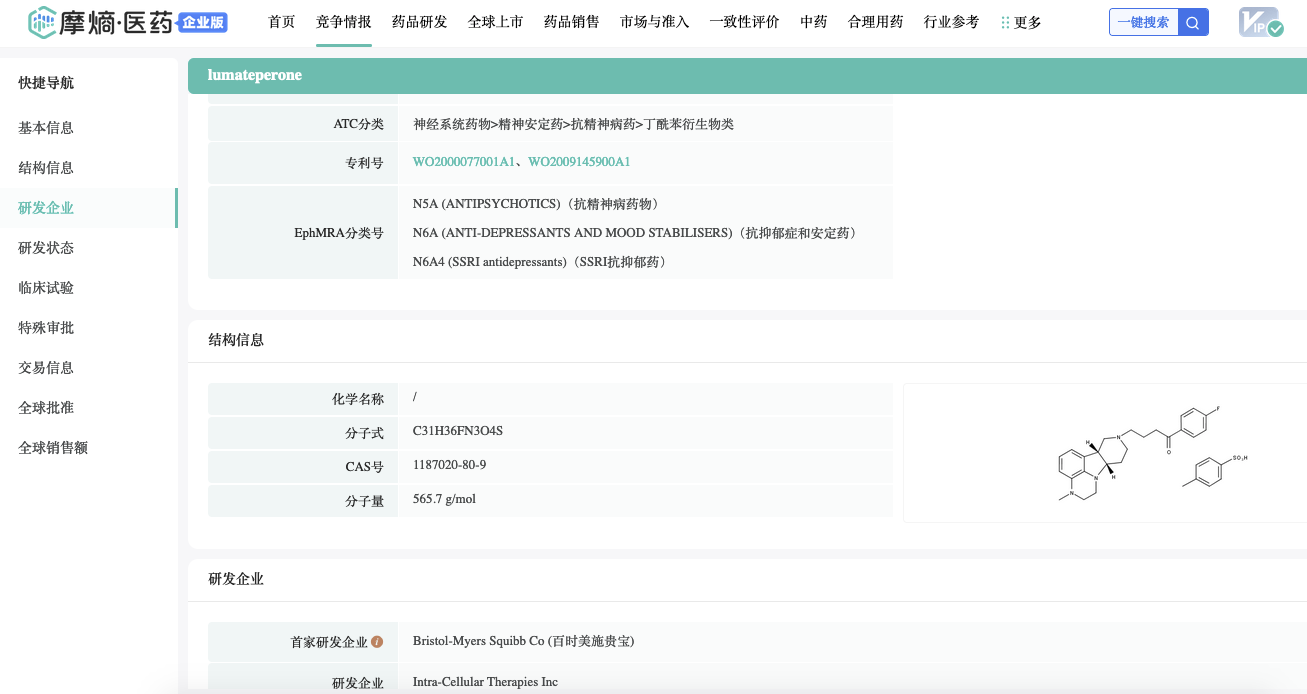 Lumateperone/卢美哌隆是一款用于治疗精神分裂、抑郁症等神经退行性疾病的创新药物,5-羟色胺2A(5-HT2A)受体拮抗剂和多巴胺受体D2调节剂。该药由Intra-Cellular开发和商业化,于2005年从BMS/百时美施贵宝手购买相关专利(2001年,BMS以78亿美元的价格收购了杜邦制药/DuPont Pharmaceuticals,多位华人科学家参与该产品研发)。截至目前,Lumateperone仍然是美国FDA批准的首个也是唯一一款用于双相Ⅰ型和Ⅱ型抑郁的辅助治疗和单药治疗的药物。