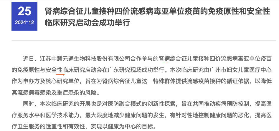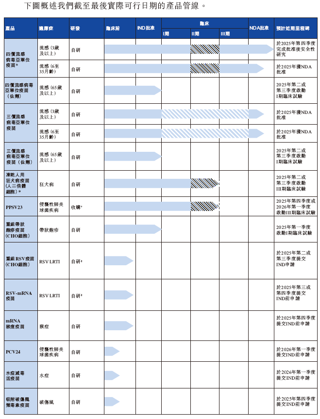 截至2025年1月15日,中慧生物的管线还包括其他11种在研疫苗:四价流感病毒亚单位疫苗(佐剂)、三价流感病毒亚单位疫苗、23价肺炎多糖疫苗、重组带疱疫苗、重组RSV疫苗、RSV mRNA疫苗、24价肺炎结合疫苗、水痘减毒活疫苗等等。