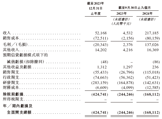 2023财年和2024财年前九个月,中慧生物的营收分别为0.52亿和2.17亿元人民币,相应的研发开支分别为2.83亿和1.43亿元,净亏损分别为4.25亿和1.68亿元。