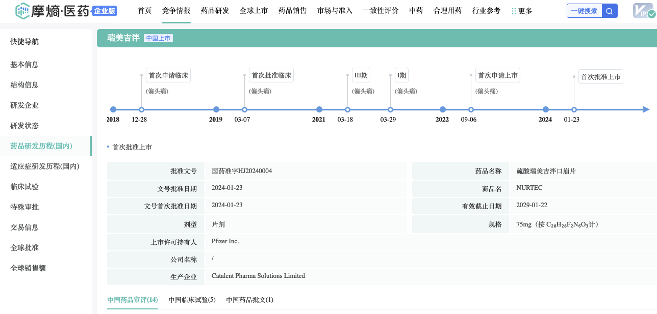 据摩熵医药数据库显示:2022 年 5 月,辉瑞宣布以 116 亿美元收购了 Biohaven。Rimegepant最初由百时美施贵宝(BMS)发现,后授权给Biohaven 进行后续开发。本品化合物专利WO-2011046997,第一发明人为华人科学家LUO GUANGLIN;是一款小分子CGRP受体拮抗剂,通过阻断CGRP配体与受体的结合而发挥其临床效应,针对病因(例如,减少硬脑膜动脉扩张、阻断神经源性炎症、抑制过度疼痛传播),特异性治疗偏头痛。