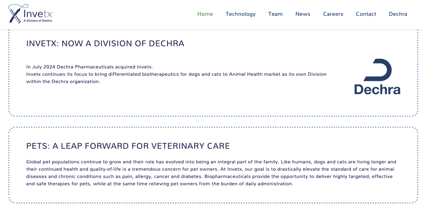 获悉:此前在2024年7月18日,来自美国波士顿的高端动保宠物药公司Invetx宣布已同意被全球巨头Dechra Pharmaceuticals Limited(德克罗) 收购,交易对价为5.2亿美元(约合37.88亿人民币)(on a cash-free and debt-free basis)。