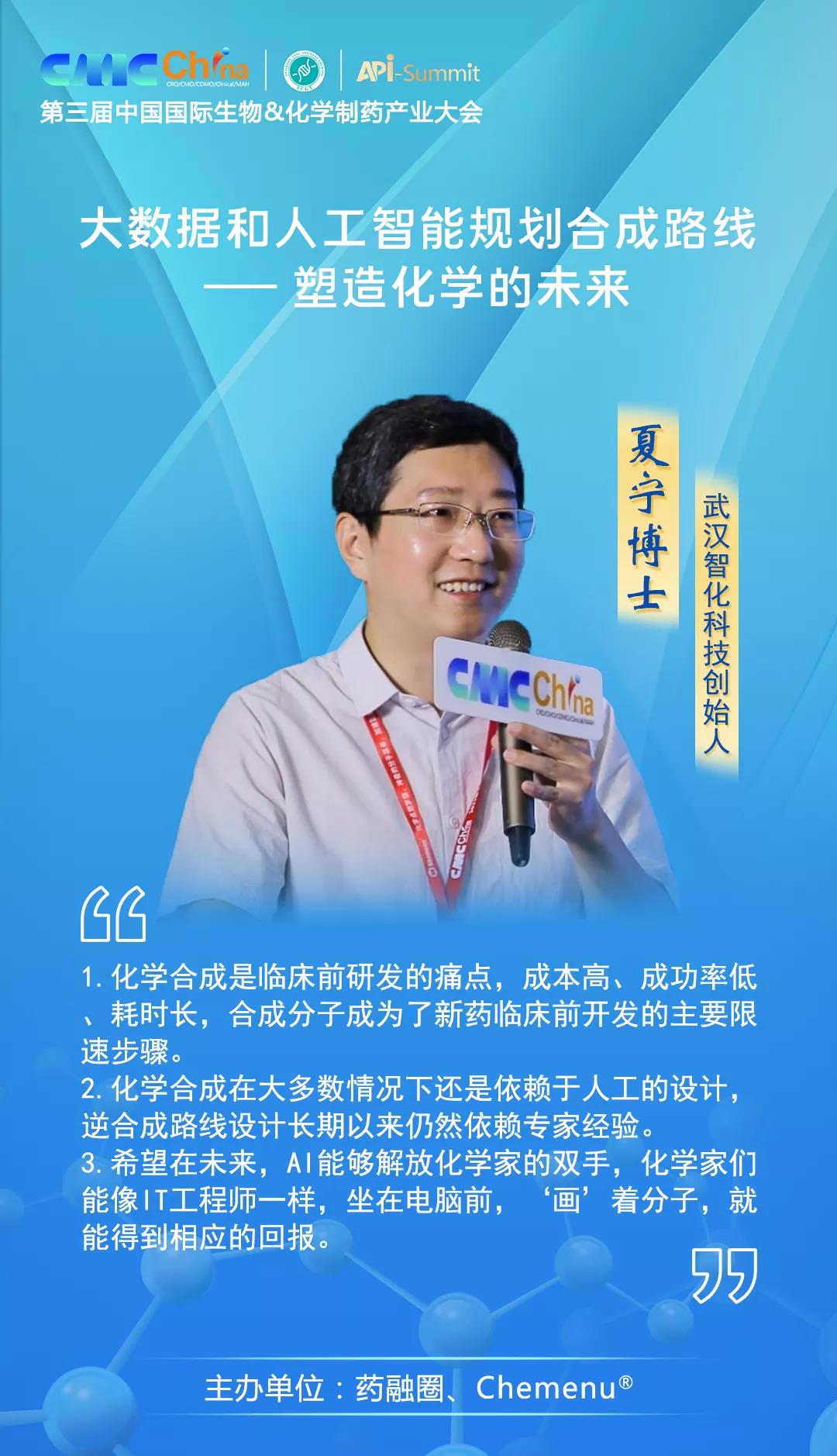 由药融圈于2021年9月29日-30日在苏州召开的“第三届中国国际生物&化学制药产业大会”有幸邀请到武汉智化科技有限公司创始人夏宁博士,就“大数据和人工智能规划合成路线——塑造化学的未来”为主题进行了分享。