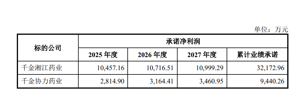 根据公司与业绩承诺方株洲国投签署的《业绩承诺及补偿协议》,株洲国投确认并承诺,业绩承诺期为本次交易实施完毕(以标的资产过户至公司名下的工商变更登记手续完成为准)后连续三个会计年度(含本次交易实施完毕的当年年度),即2025年度、2026年度和2027年度;在前述业绩承诺期内,千金湘江药业净利润(指合并报表范围扣除非经常性损益后归属于母公司所有者的净利润,下同)分别不低于10,457.16万元、10,716.51万元及10,999.29万元;千金协力药业净利润分别不低于2,814.90万元、3,164.41万元及3,460.95万元。