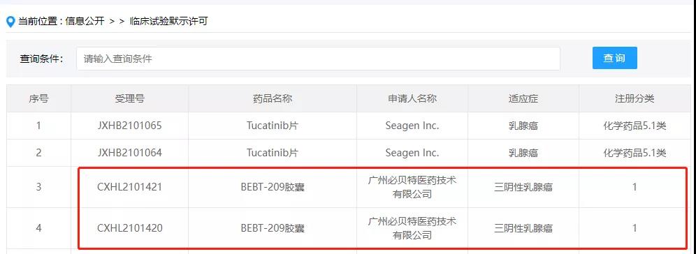 据CDE官网显示,广州必贝特医药的1类新药BEBT-209胶囊再次获批临床,适应症为三阴性乳腺癌。