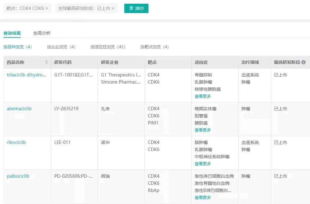 据统计,全球已有近40款在研CDK4/6抑制剂。国内已有恒瑞医药、四环医药、甘李药业、复星医药、豪森药业等多家药企布局,其中恒瑞医药进展最快,其自主研发的SHR6390片已递交上市申请,并于今年5月纳入优先审评程序,有望成为国产首款、国内第3款CDK4/6抑制剂。