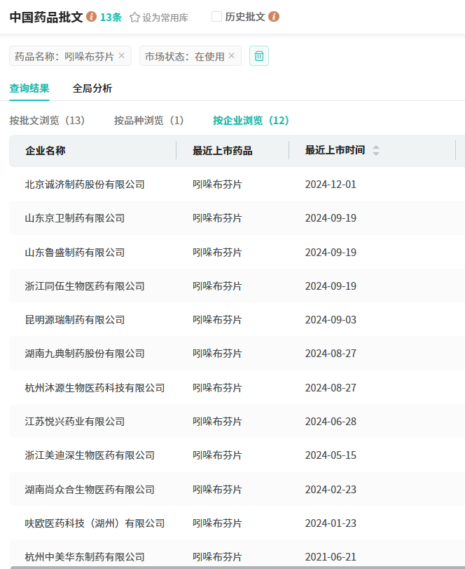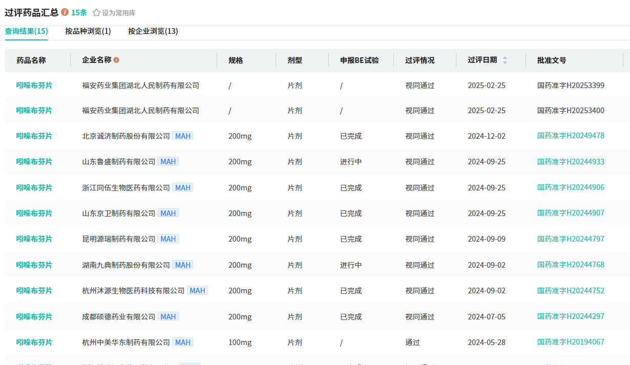 目前,吲哚布芬凭借卓越的临床疗效与显著的市场成绩,已有14家国内药企提交3类注册仿制申请上市,均处于审评审批阶段。在已通过评的企业中,福安药业集团于今年2月25日率先获得批准。除长期保持市场领先地位的中美华东制药外,另有超10家企业均在2024年过评,包括山东京卫制药、山东鲁盛制药、成都硕德药业、昆明源瑞制药、杭州沐源生物医药及湖南九典制药等。