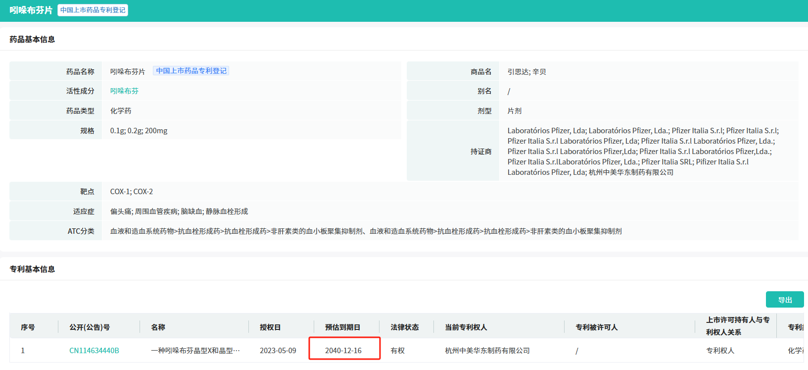 吲哚布芬片,作为一款历经40年市场考验的药品,近年年销售额持续超十亿元,为华东医药贡献了可观的利润。为了持续延长这一成熟产品的市场竞争力,中美华东不仅积极发起专利诉讼,还为其申请了晶型专利保护。据国家知识产权局官网信息,中美华东制药已成功登记了相关专利,有效期将延续至2040年。此外,中美华东还构建了一系列专利组合,包括吲哚布芬药物组合物、晶型E及其制备方法等,形成了严密的专利壁垒。