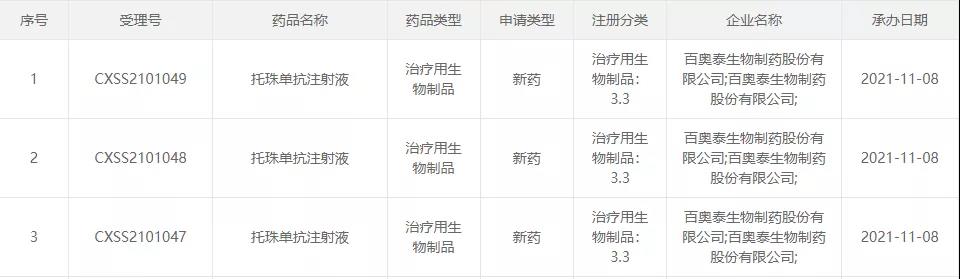 11月8日,CDE承办了百奥泰递交的托珠单抗注射液上市申请。这是我国首家报产的托珠单抗生物类似药。