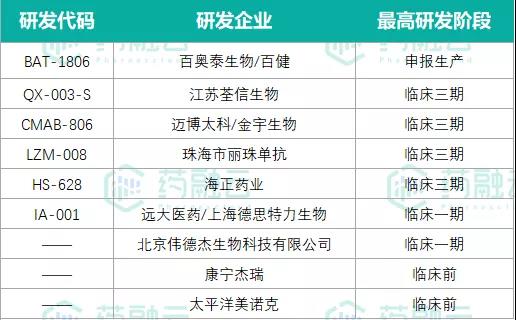 其中百奥泰进展最快,已递交了上市申请并获受理。荃信生物的QX-003-S、金宇生物的 CMAB806 、海正药业的 HS628 和丽珠单抗的 LZM008 已进行至临床Ⅲ期阶段。