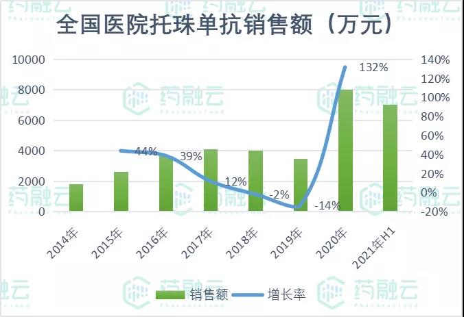 然而,托珠单抗在国内的销售却不太乐观,2018-2019年更是连续下滑。2019年8月,托珠单抗被正式纳入中国国家医保目录,作为乙类品种,用于全身型幼年特发性关节炎二线治疗,以及诊断明确的RA经传统DMARD治疗3~6个月疾病活动度下降低于50%的患者。至此,托珠单抗在国内的市场得以快速放量,展现惊人潜力。2020年在全国医院的销售额以132%的增长率突破8000万元,2021年H1更是同比增加525%,市场前景令人期待。