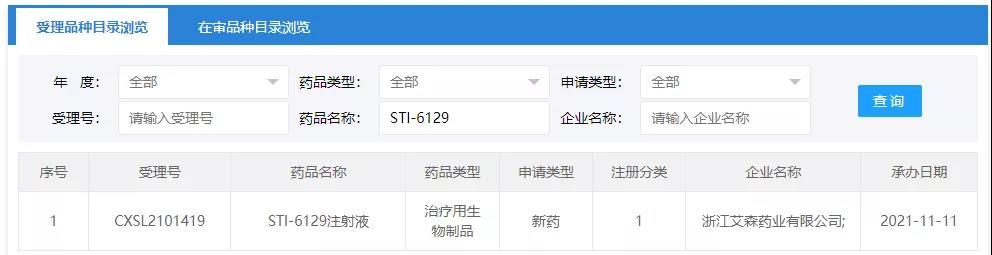 2021.11.11,CDE承办了浙江艾森药业有限公司1类新药STI-6129注射液的临床申请。STI-6129 是一种抗体偶联药物 (ADC),由全人源单克隆抗 CD38 抗体通过专有连接子Linker与 Duostatin 微管蛋白抑制剂共价结合组成。