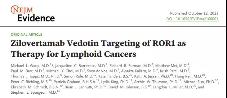 [2] Wang ML, Barrientos JC, Furman RR, et al. Zilovertamab Vedotin Targeting of ROR1 as Therapy for Lymphoid Cancers. NEJM; Published online 12 October 2021.