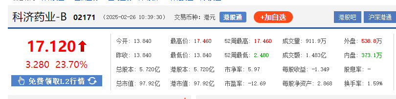 科济药业早盘持续走高,股价上涨23.7%,现报17港元,显示出市场对此次合作的高度认可。