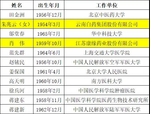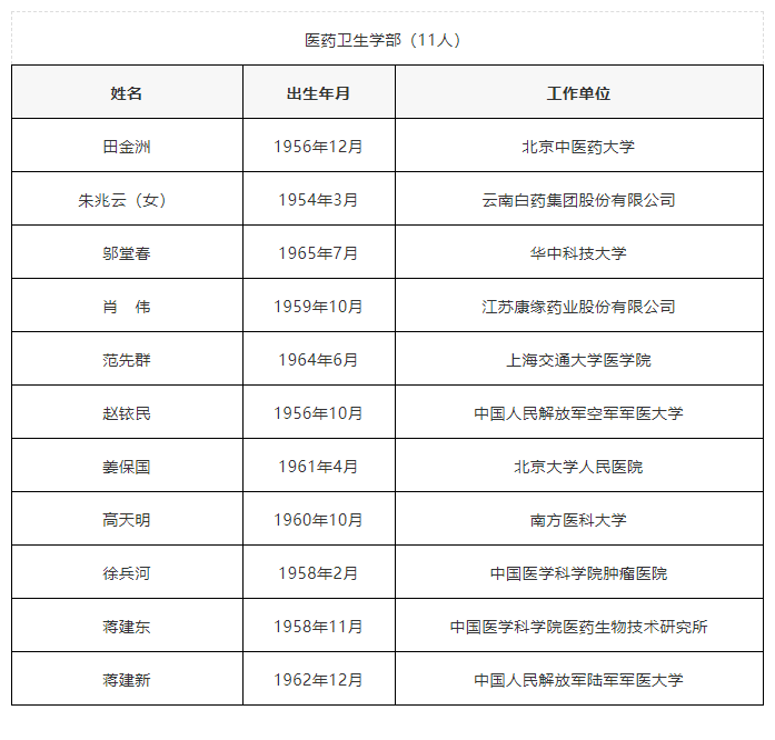 中国工程院医药卫生学部(11人)包括:云南白药集团股份有限公司朱兆云(女),以及江苏康缘药业股份有限公司肖伟等多人。