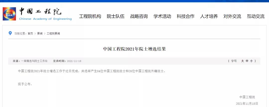 中国工程院2021年院士增选工作于近日完成,共选举产生84位中国工程院院士和20位中国工程院外籍院士。