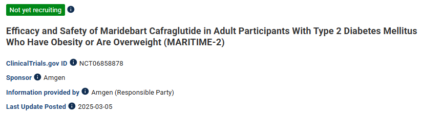与此同时,MARITIME-2则是一项针对999名伴有2型糖尿病的肥胖或超重成人的随机、双盲、安慰剂对照试验,同样旨在探索AMG 133(低、中、高剂量)的有效性、安全性及耐受性,其关键评估指标与MARITIME-1一致。