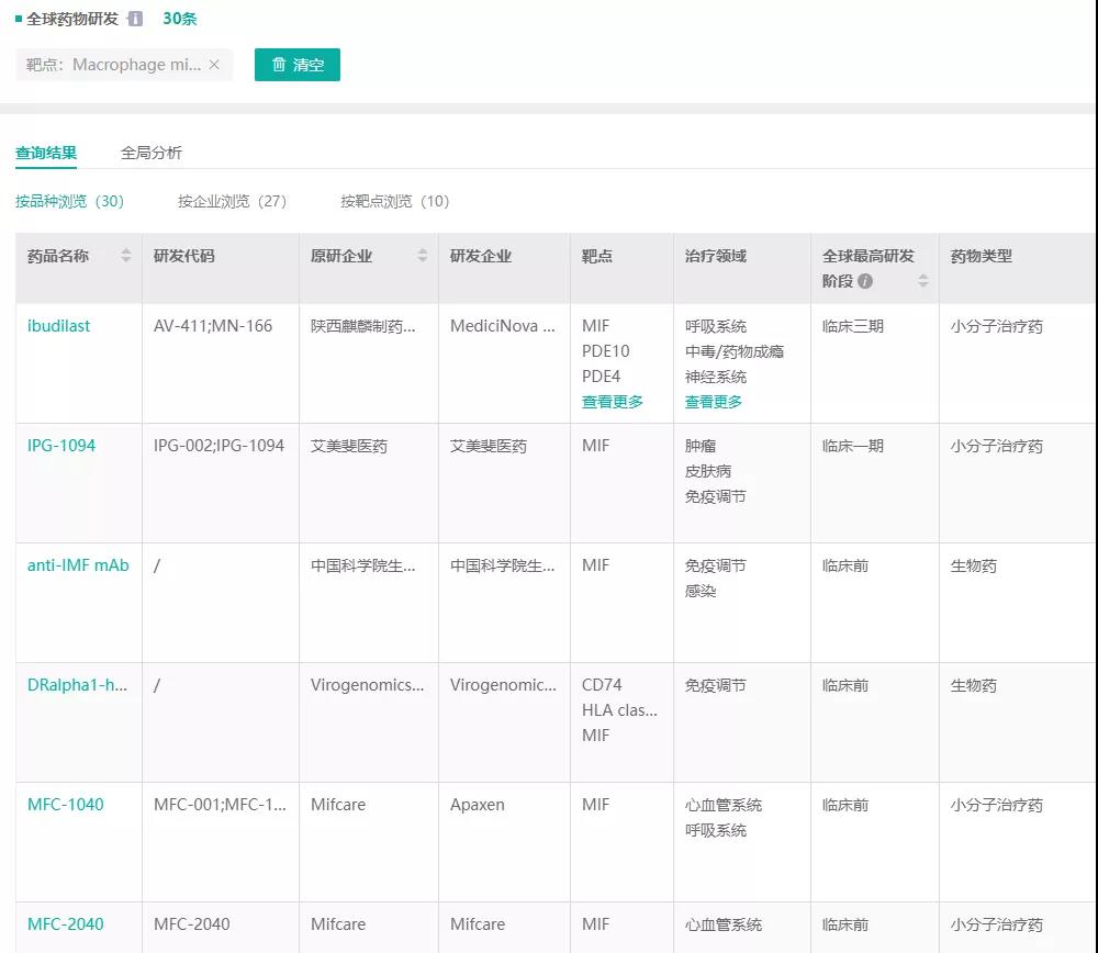 据药融云查询,目前全球尚无MIF靶点药物获批上市。在开展MIF靶点药物布局的企业中,陕西麒麟制药进展最快,已到临床三期阶段。