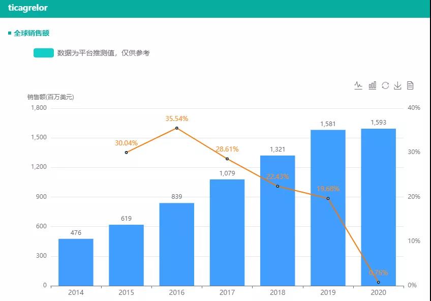 替格瑞洛原研厂家为阿斯利康,商品名为倍林达(Brilinta), 2010 年 12 月在欧盟获批, 2011年7月获FDA批准,据药融云估算,2020年倍林达全球销售收入超15亿美元。