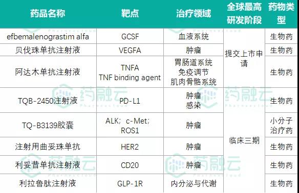 据药融云数据库统计,正大天晴在研产品中,目前有8款药品处于临床三期及以上阶段,除TQ-B3139外,均为生物药。