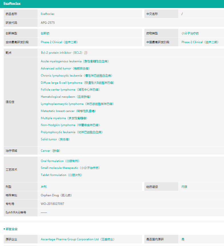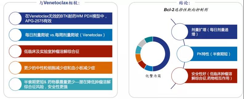 由于难成药、且副反应较重,Bcl-2药物可谓几经波折。目前,全球仅有维奈托克(Venetoclax )一款药物获批上市,但上市后该药的市场表现令人眼前一亮。而APG-2575已披露的临床试验数据显示,其或将成为Venetoclax 的有力竞争者。