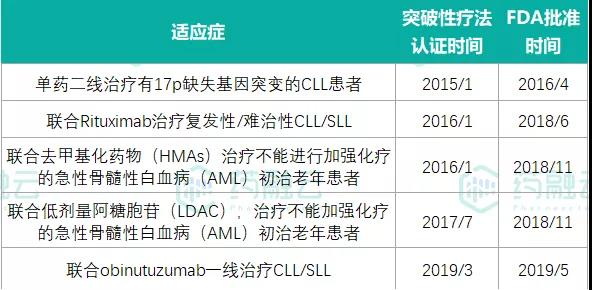 维奈托克曾被授予5项“突破性疗法”资格认证,获批4个适应症。