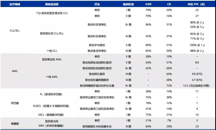 疗效方面根据亚盛医药ASCO会议上口头汇报的临床进展,在15例R/R CLL/SLL患者中有12例获得部分缓解(PR),总缓解率ORR高达80.0%,与维奈托克疗效视为等效,维奈托克缓解率达到79%。