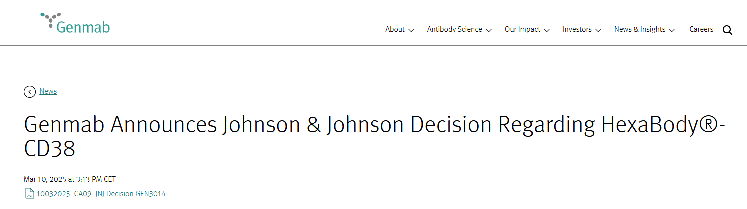 3月10日,Genmab宣布强生决定不再行使 HexaBody-CD38(GEN3014)的全球开发和商业化选择权。消息出来后,Genmab股价下跌7.8%。