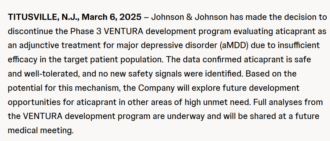 3月7日,强生停止了其在研药物aticaprant用于治疗重度抑郁症(MDD)的3期项目,原因是“疗效不足”。