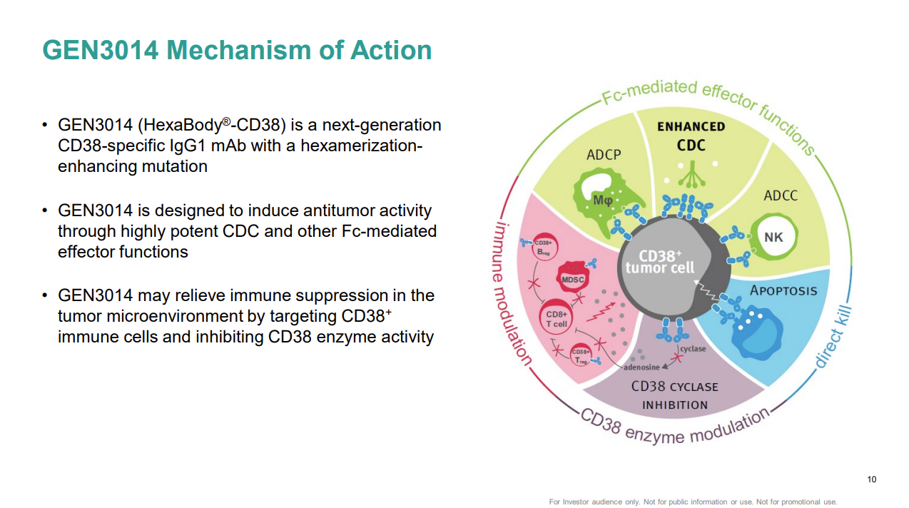GEN3014是新一代的 CD38 特异性 IgG1 单抗,结合了 Genmab 专有的 HexaBody 技术,旨在通过高效的 CDC 和其他 Fc 介导的效应功能诱导抗肿瘤活性。