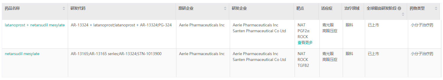 经药融云数据库查询,这两款滴眼药都是ROCK抑制剂,除此以外还共同拥有NAT、TGFB2靶点,都是用于治疗降低开角型青光眼或高眼压患者的高眼压。Rhopressa® 最早于2017年12月在美国获FDA批准上市,Rocklatan®最早于2019年在美国上市。且据药融云估计,Rhopressa®在2018年的全球销售额达2亿4千万美元。