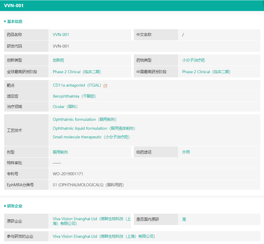 药融云数据显示,眼科领域本靶点新药,中国在研企业有维眸生物(VVN539);成都先导(HGC-245);四川大学等等。其中,维眸生物是专注于眼科治疗领域的临床阶段创新药公司,成立于2016年;公司由国际一流的眼科药物研发专家团队组建,已经建立起独特的眼科创新药研发平台,自主研发的多个创新药产品已经或即将进入临床阶段。其中,针对干眼症的VVN001进展最快,现已处于临床2期研发阶段。