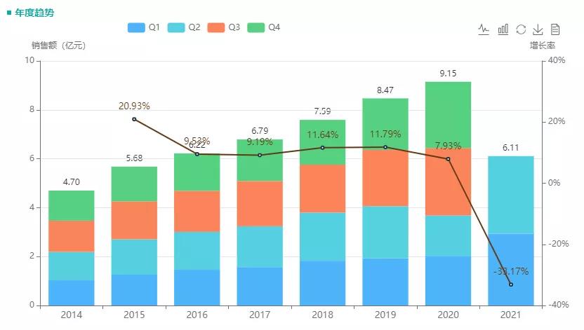 经药融云查询,上海医药同时具有羟氯喹的原料药和制剂批文,也是唯一拥有羟氯喹制剂生产批文的国内企业。虽然药物上市时间已久,但每年硫酸羟氯喹的销售额仍稳定上涨中,2021年H1院内销售额更是同比增长66%,今年总额突破10亿在望。作为仿制药,上海上药的硫酸羟氯喹片在近几年的销售成绩尤为亮眼,拥有近8成的市场份额。
