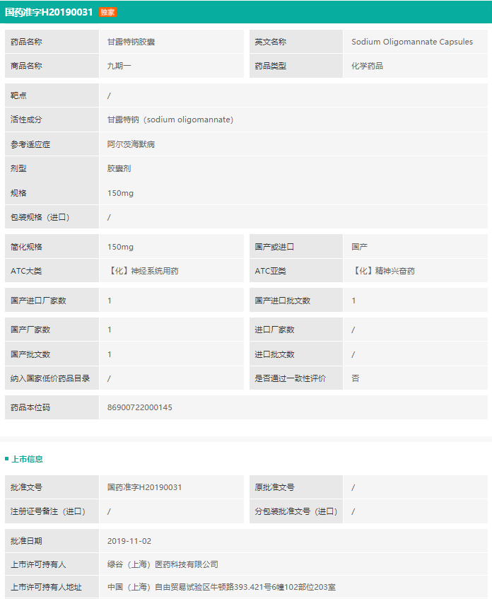 经药融云数据库查询,此前早在2019年11月,国家药品监督管理局就有条件批准了甘露特钠胶囊(商品名“九期一”)上市注册申请(批准文号:国药准字H20190031),用于轻度至中度阿尔茨海默病,改善患者认知功能,且到目前还是仅有绿谷医药拥有药品批文,独家生产。九期一是以海洋褐藻提取物为原料,制备获得的低分子酸性寡糖化合物,是我国自主研发并拥有自主知识产权的创新药,获得国家重大新药创制科技重大专项支持。