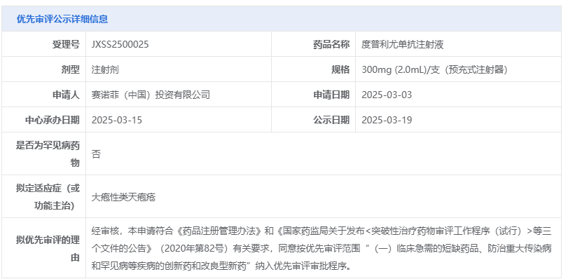 3月19日,据CDE官网最新公示,赛诺菲提交的度普利尤单抗注射液新适应症大疱性类天疱疮上市申请拟纳入优先审评审批程序。据摩熵医药数据库显示,这是度普利尤单抗拟在华获批的第五项适应症,此前已获批适应症包括哮喘、特应性皮炎、结节性痒疹和慢性阻塞性肺病。