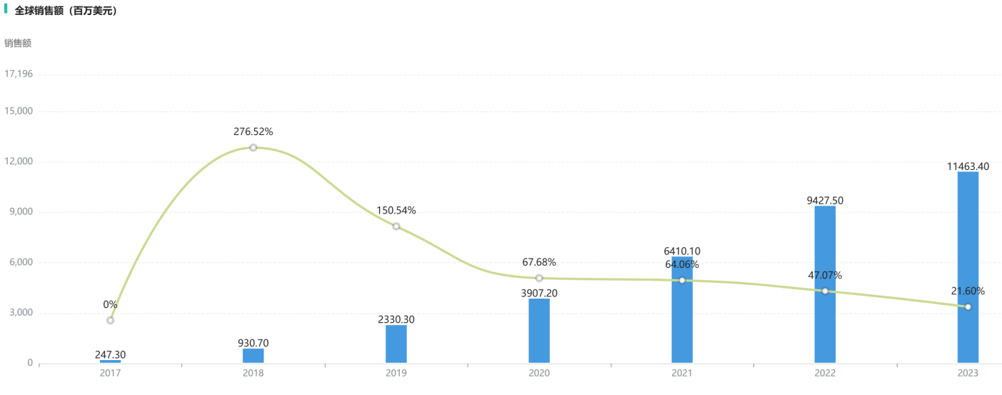 根据摩熵医药全球药物研发数据库显示,度普利尤单抗获批上市后销售额快速增长,上市7年即突破100亿美元,2023年全球销售额约114.63亿美元,2024年销售额更是高达141.79亿美元。