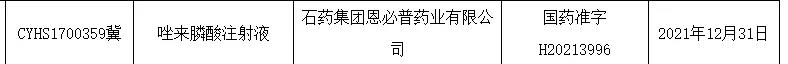 经药融云查询,唑来膦酸注射液是石药集团恩必普药业过评的第3个品种,其余两款药品分别为乙磺酸尼达尼布软胶囊(2021年3月视同通过)和盐酸替罗非班氯化钠注射液(2021年11月通过)。