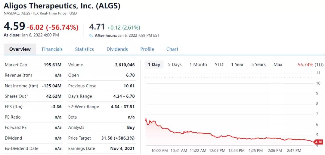 1月6日,临床阶段的生物技术公司Aligos Therapeutics(纳斯达克股票代码:ALGS)透露,已经停止进一步开发针对慢性乙型肝炎 (CHB) 的实验药物 ALG-010133。公司股价当日下跌57%。