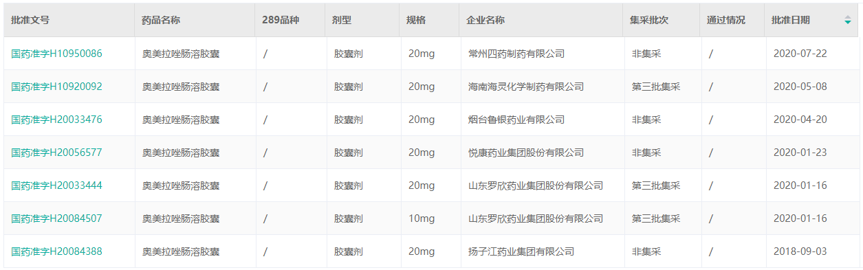 锦州九泰药业旗下的奥美拉唑肠溶胶囊的此次过评为第7家过评,此前已有6家过评。分别是常州四药制药、海南海灵化学制药、烟台鲁银药业、悦康药业、山东罗欣药业、扬子江药业。详情见下。