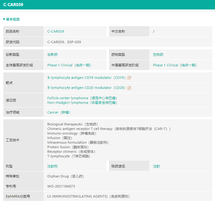 另外,在2021年6月, C-CAR039已被美国食品和药物管理局 (FDA)授予孤儿药认定 (ODD),用于治疗滤泡性淋巴瘤,一种惰性形式的非霍奇金淋巴瘤。同年12 月 10 日FDA正式批准了 C-CAR039 的 IND申请 。