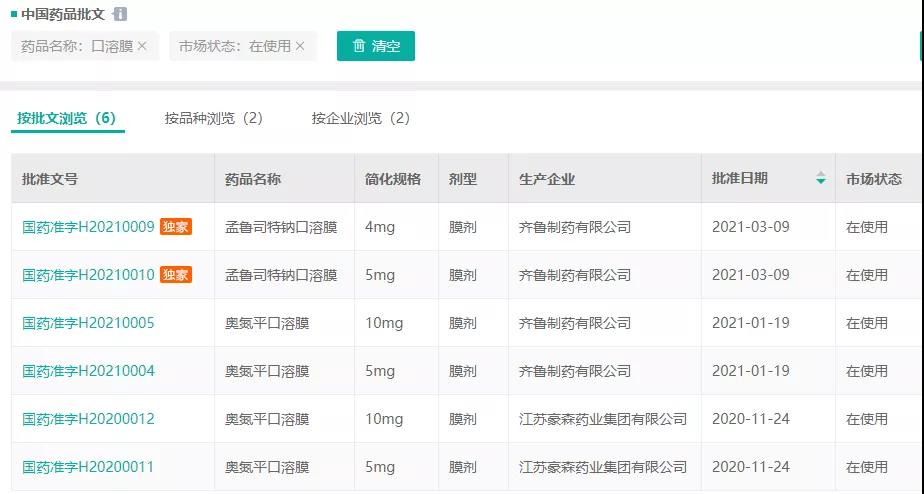 口溶膜是膜剂的一种,由药物和成膜材料组成,一般是将一定剂量的化学药品或中药提取物的有效成分固定在变性淀粉及胶体做成的薄膜片上,其大小、形状、厚度类似于邮票,将其置于舌上,无需喝水即可在唾液中快速溶解、释放药物。目前口溶膜上市产品并不多,从药品来看只有奥氮平口溶膜和孟鲁斯特纳口溶膜两种。从企业来看,均来自齐鲁制药和江苏豪森药业两家。