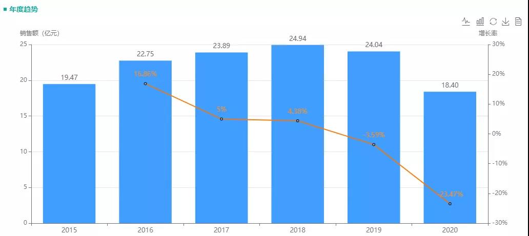 西地那非原研辉瑞,为ED一线用药。目前国内已上市的西地那非共有 15 家企业,包括原研辉瑞、白云山、亚邦爱普森、常山生化、成都地奥制药等。经药融云查询,国内西地那非在全国药店2019销售额超24亿元,2020年下滑至18亿元。总体来看,国内由原研辉瑞的「万艾可」主导市场,2020年市场份额近7成,随后份额前三的企业分别是白云山(30.67%)、亚邦爱普森(4.62%)和吉林金恒制药(3.37%)。