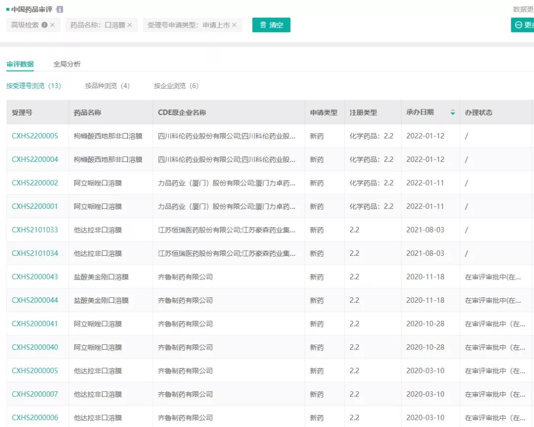 根据CDE收审数据来看,目前经CDE受理的口溶膜产品大多数为抗精神疾病药物和ED治疗药物。其中申报上市的,除上述两款药品外,国内还有4款药品的口溶膜产品。其中,齐鲁制药报产有3款产品:他达拉非口溶膜、阿立哌唑口溶膜和盐酸美金刚口溶膜;恒瑞与豪森联合申报了他达拉非口溶膜;力品药业/厦门力卓药业也申报了阿立哌唑口溶膜;科伦申报有枸橼酸西地那非口溶膜。