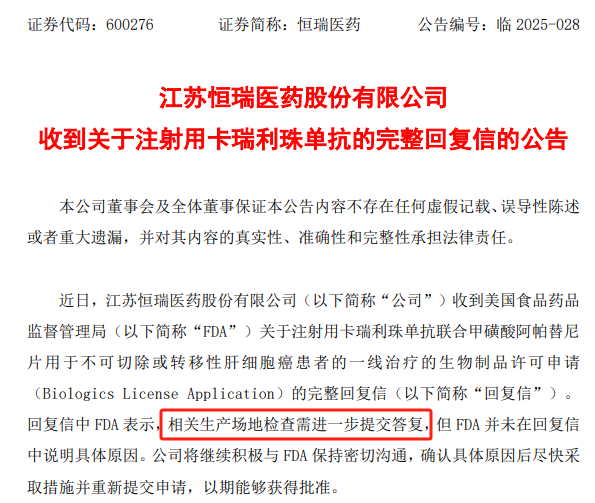 3月22日,恒瑞医药公告称:收到FDA关于卡瑞利珠单抗联合甲磺酸阿帕替尼用于不可切除或转移性肝细胞癌患者一线治疗的生物制品许可申请的完整回复信。回复信中,FDA表示相关生产场地检查需进一步提交答复,但FDA并未在回复信中说明具体原因。