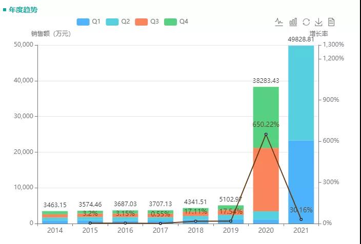 盐酸纳布啡属于κ受体激动剂/μ受体部分拮抗型镇痛药,临床上可用于舒缓中至重度疼痛,也能作为联合麻醉时的辅助用药。此前,国内纳布啡由人福药业独家生产销售,且已于2021年3月通过一致性评价。2020年纳布啡院内销售额为4亿元,2021年上半年已达3.4亿,同比增加168%。