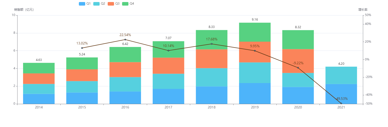 根据药融云的销售数据库来看,奥美拉唑肠溶胶囊的销售数据一直以来都比较平稳,在2014-2019年销售额总体呈持续增长趋势,并于2019年达到峰值9.16亿元。但在2020年开始第一次走下坡路,下跌9.22%。就2021年前两个季度的销售额来看,预计全年销售额同比2020会有一定的回升,挽回下跌的局面。