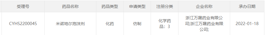 据CDE官网,浙江万晟药业递交的3类仿制药米诺地尔泡沫剂上市申请获受理。目前国内尚无同类产品获批上市。