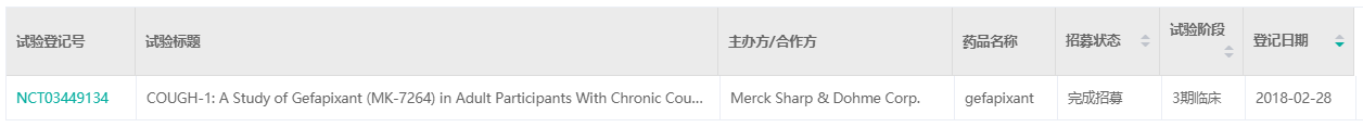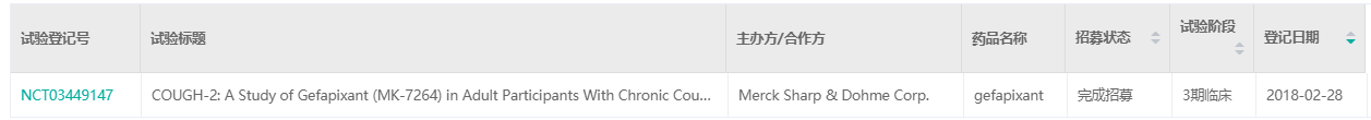 2022年1月20日,日本厚生劳动省(MHLW)批准MSD(Merck & Co,默沙东)和日本杏林制药株式会社的Gefapixant citrate片剂(MK-7264,AF-219,RO4926219)(商品名:Lyfnua®)上市,用于难治性慢性咳嗽的治疗。经药融云数据查询,本次在日本获批依据名为COUGH-1研究(临床试验登记号:NCT03449134,MK-7264-027)和COUGH-2研究(临床试验登记号:NCT03449147,MK-7264-030)的两项3期临床试验结果。Gefapixant是全球获批的首款选择性P2X3受体拮抗剂。