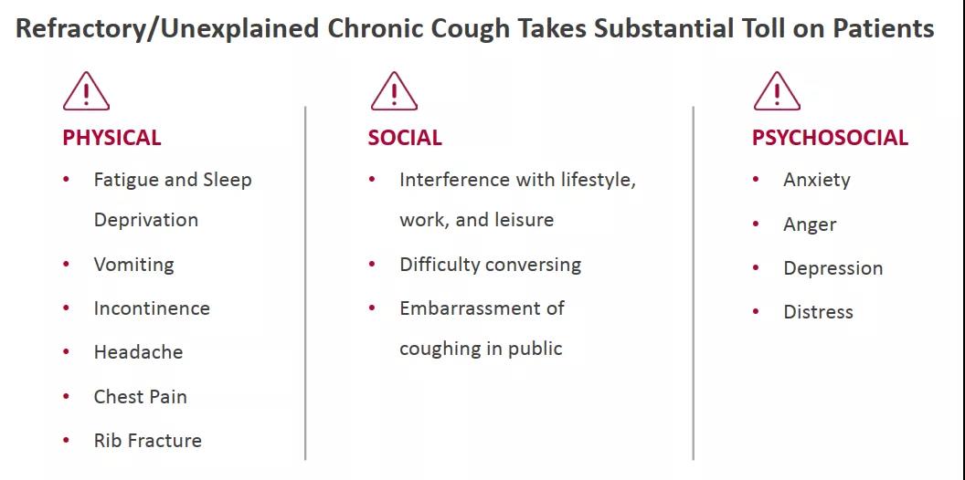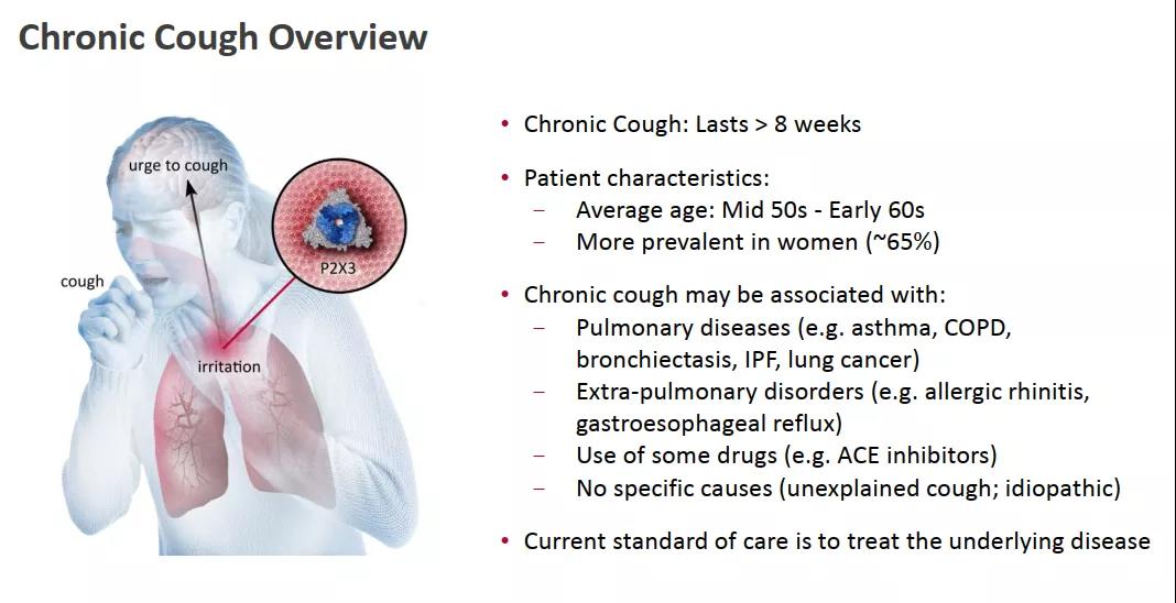 难治性慢性咳嗽是指经过全面检查仍无法明确病因,或经过常规治疗后咳嗽仍然没有明显缓解的咳嗽。可由哮喘、COPD、支气管扩张、胃食管反流疾病和上气道咳嗽综合征等引起,但仍有高达60%的患者在针对这些潜在病因治疗后还不见效,且有相当多的患者无法探明咳嗽病因(即不明原因的慢性咳嗽)。慢性咳嗽可导致生活质量严重下降,如胸痛、尿失禁、晕厥和头痛,甚至可能出现抑郁、焦虑、睡眠障碍和社交障碍。相关数据显示,全球有4%-10%的成年人患有慢性咳嗽。